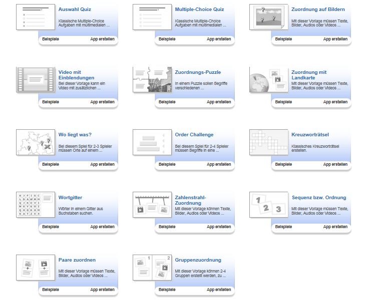 Die Abbildung zeigt die Möglichkeiten zur Erstellung von LearningApps